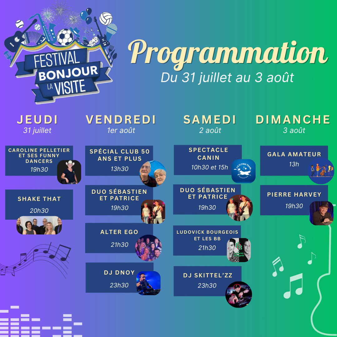 Le Festival Bonjour la visite revient en grand pour une 22e édition haute en couleur du 31 juillet au 3 août à Saint-Pascal. Quatre jours de festivités, de musique et de retrouvailles vous attendent sous le grand chapiteau, dans une ambiance qui promet d’être électrisante !